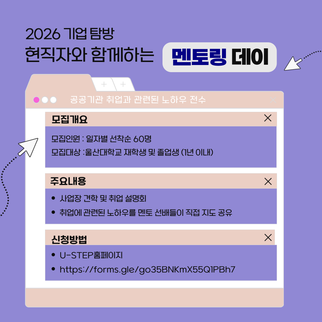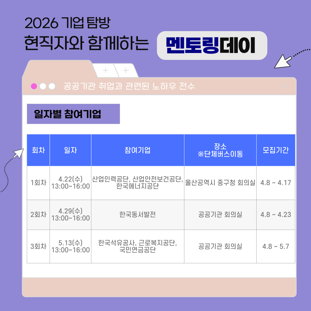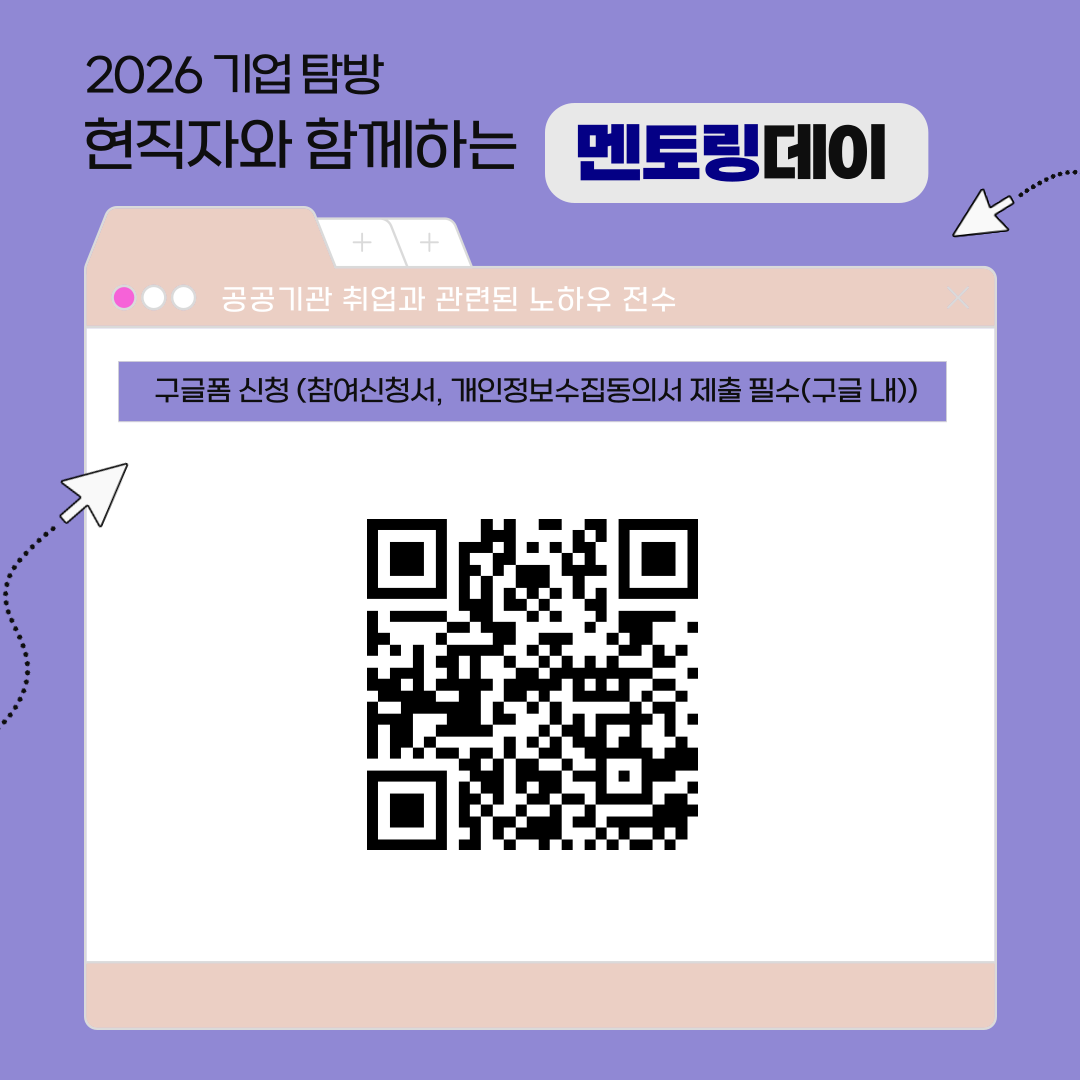 가. 프로그램: 2026학년도 기업탐방 「멘토링데이」 공기업편 나. 운영기간: 2026.4.22.(수), 4.29.(수), 5.13.(수) 13:00 ~ 16:00 다. 운영내용: 각 기업 본사 방문 및 탐방, 기업소개, 현직자 멘토링